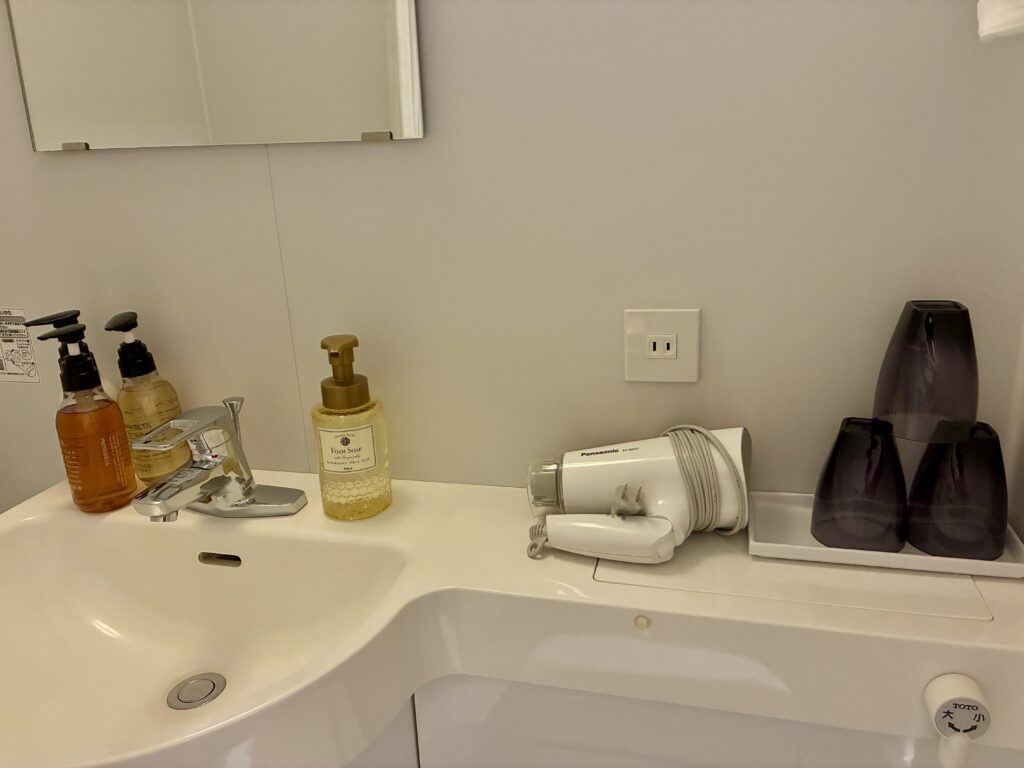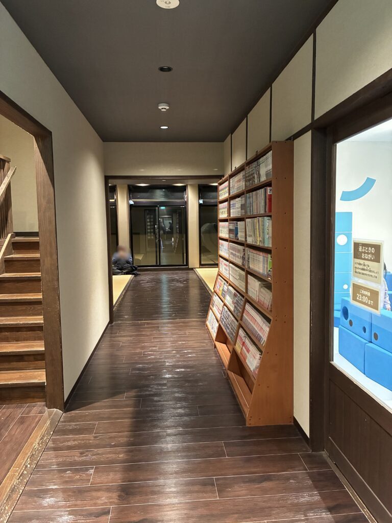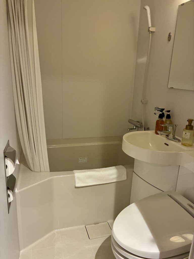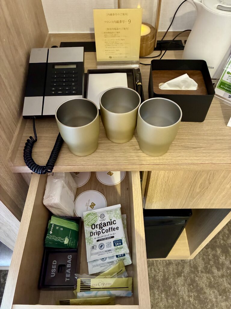 朝の到着時に受付は済ませてあるので、カードキーと預けた荷物をもらい、フロント横のアメニティコーナーから必要な分を取って部屋に向かいます。