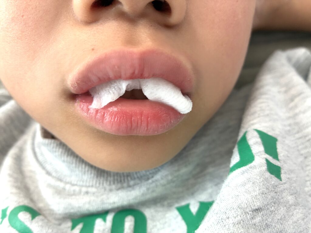 焼き切ってさっさと帰ってきた息子は口に綿を挟んでいました。